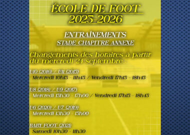 Saison 2025/2026 Baby Foot (enfants nés en 2021) : les samedis 10h30 – 11h30 U6-U7 (enfants nés en 2020 et 2019) : les mercredis...