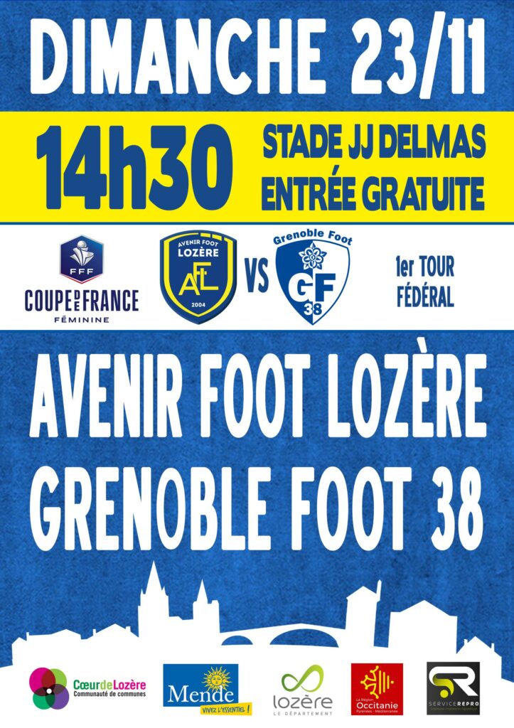 Ce DIMANCHE 23 NOVEMBRE 2025 à 14H30 au Stade Jean-Jacques Delmas, l’AVENIR FOOT LOZÈRE va recevoir l’équipe de GRENOBLE FOOT 38.
